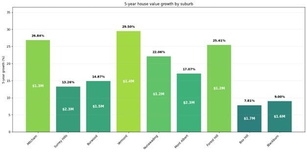 Mitcham has also seen substantial uplift, with house values increasing 26.8%, while Burwood has recorded more moderate growth of 14.9%.