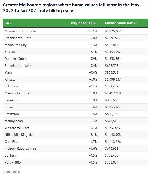 Recent interest rate rises have had uneven effects across Melbourne, with Cotality data showing some established areas were more sensitive to higher borrowing costs than others during the May 2022 to January 2025 tightening cycle.